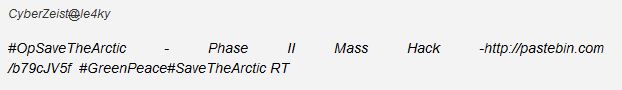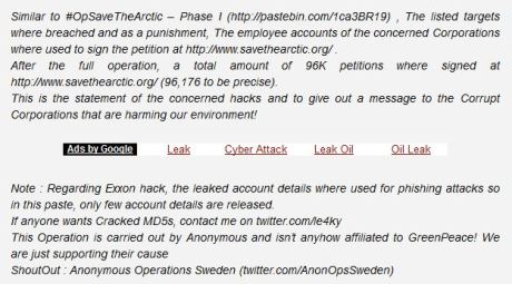 According to CyberWarNews.com Anonymous set its sites on oil giants Shell, BP, Gazprom, and Rosneft in what has been dubbed “Save the Arctic Phase 2”. This comes on the heels of phase one in which account details including administrator accounts, passwords and other server info was stolen from Exxon and released.
