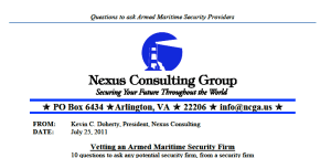Nexus Consulting’s CEO, Kevin Doherty was kind enough to let me post a questionnaire his company developed specifically for companies considering the use of armed security on ships. Nexus has conducted hundreds of transits through the Gulf of Aden and is one of the original maritime security companies and currently one of only 3 companies in the US that work with US Flagged vessels. Please download the document here.